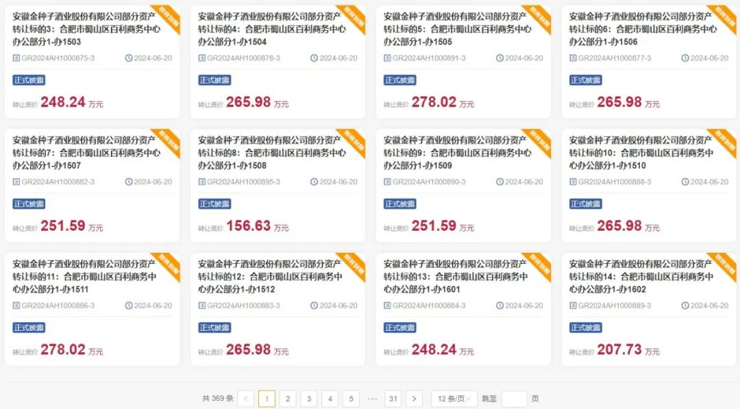 安徽产权交易中心官网显示,自6月14日起,本地知名老字号金种子酒挂牌出售近百处办公与住宅用房,转让底价从14万元到809万元不等,合计达到1.62亿元。