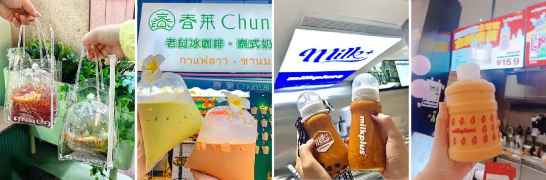 此前春莱和芭堤啦都主打袋装奶茶。塑料袋加冰加饮品,用小皮筋扎口,系上一朵鸡蛋花,最后放入一个纸袋里,形式特别,也容易出片。