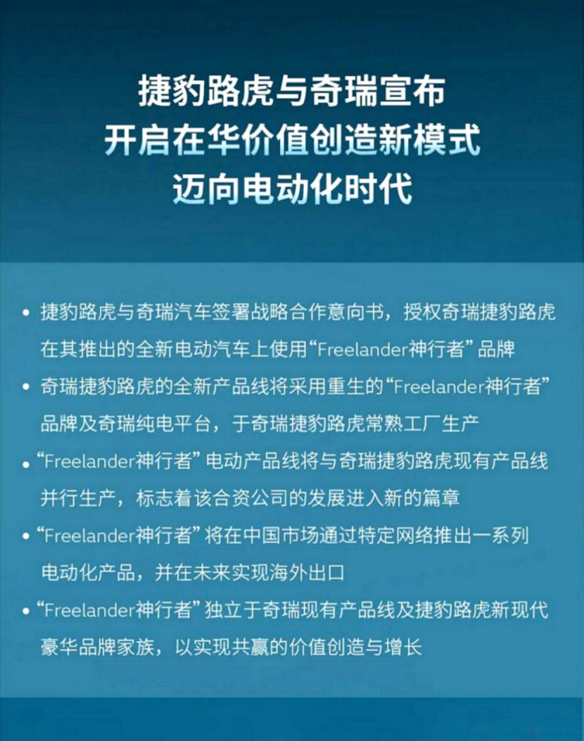 1、奇瑞捷豹路虎将获得“Freelander神行者”商标,并用于新的纯电动汽车品牌;