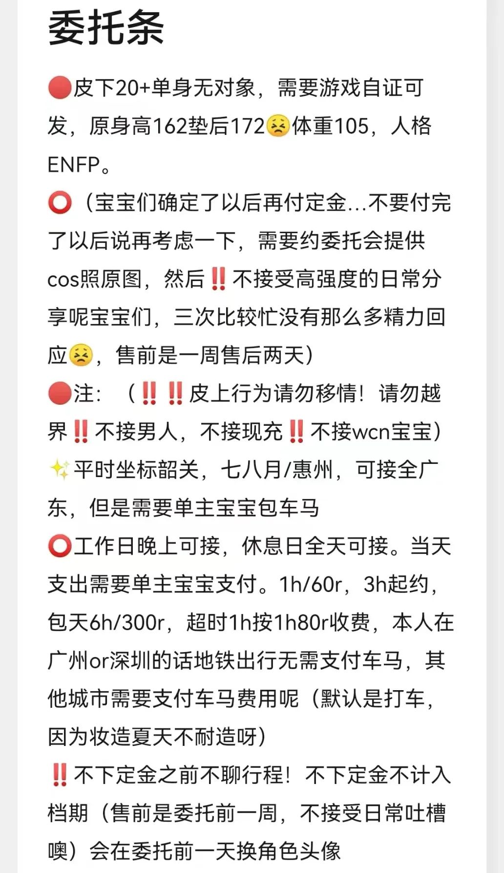 在小红书个人主页,她们会置顶自己的“委托条”,标明自己的位置坐标、可接角色、包天价格,以及售前售后需求等,方便单主们快速筛选。