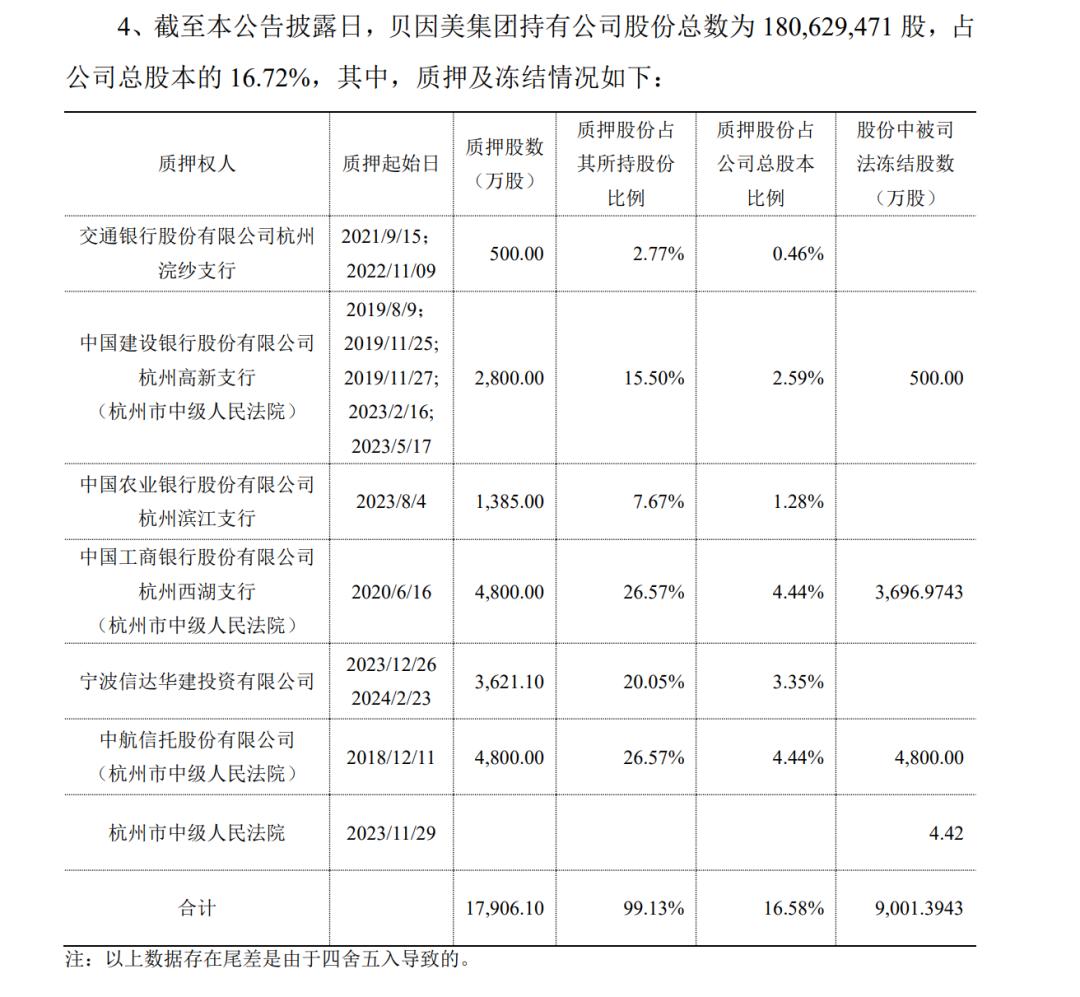 贝因美集团是贝因美的控股股东,所持股份总数约为1.81亿股,占贝因美总股本16.72%。截至目前,贝因美集团质押/冻结上市公司股份数量约为1.79亿股,占其所持贝因美股份总数的99.16%。