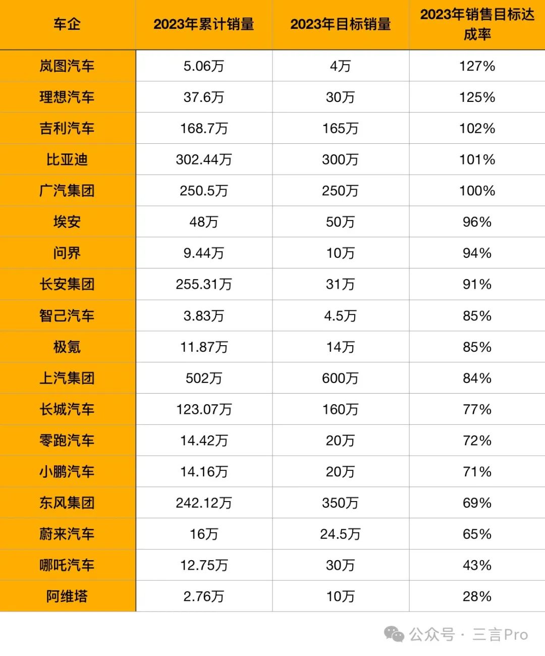 上表是大部分今天统计的车企2023年销量以及销售目标达成率情况,可以看出,除了阿维塔仅完成28%销量目标和哪吒汽车完成43%销量目标不足五成外,其他大部分车企完成度都相当高。