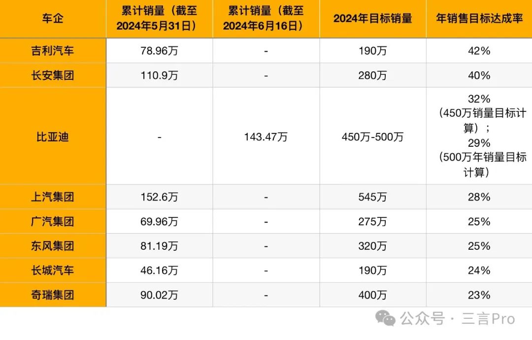 比亚迪位列第三,2024年,比亚迪目标销量为450万至500万辆,截至今年6月16日,比亚迪累计销售143.47万辆。若按照450万辆销售目标计算,则目标达成率为32%;若按照500万辆销售目标计算,则目标达成率为29%。