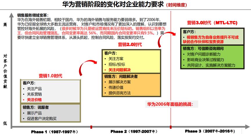 1998-2007年属于营销2.0阶段。这个阶段开始招投标,说明客户会关注方案。华为的销售需要向客户提供解决方案,传递价值,甚至提供咨询方法。