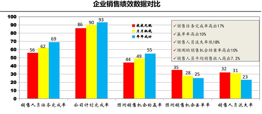 总之,红色部分,我们称为“夜夜无眠型企业”,表现为低销售绩效的企业,老板经常为订单发愁,导致无法入睡,销售负责人“夜夜无眠”,处于高度紧张且疲惫的竞争状态;黄色表现为“月月挑战型企业”,比“夜夜无眠”更强;蓝色则为“年年成功型企业”,表现为高销售绩效的企业。