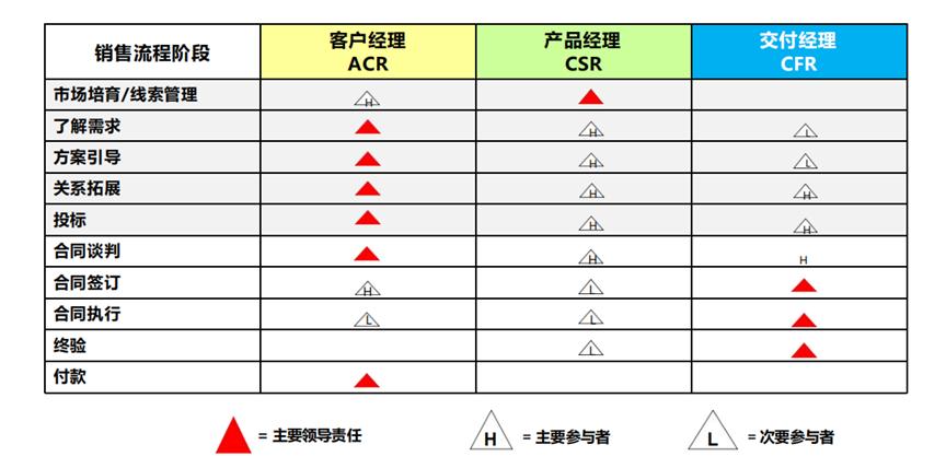 无论是客户经理、产品经理还是交付经理,他们各自在流程的每一阶段都扮演着主要的领导责任、主要参与者以及次要参与者的角色。