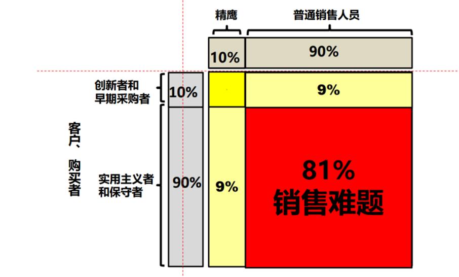 因此,具体如上图所示,根据企业销售团队两类人员的分布情况,再结合两种客户的分类:当10%的销售精英,遇到创新者客户时,一个愿意买遇到又善于卖的人,销售过程会很快完成。当10%的销售精英遇到90%保守主义客户时,同样也能完成销售。