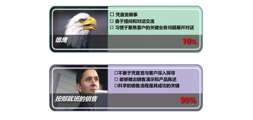 10%的销售精英,是那种生来具有销售天赋的人才,他们可以凭直觉做事,善于倾听、发问,对话交流非常深入,可以聚焦到客户的关键业务问题展开对话,完成整个销售团队60%-70%的销售任务,但这种人凤毛麟角,可遇不可求。