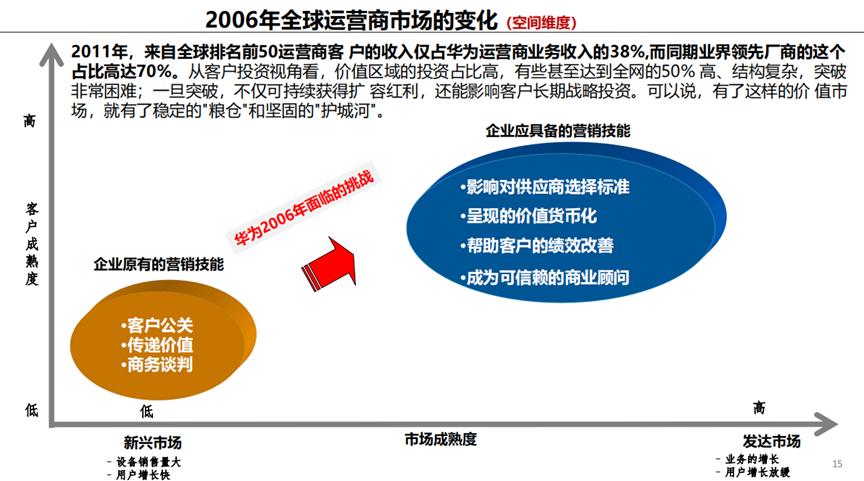 在全球市场中,无论是新兴市场还是发达市场,客户成熟度的高低都对运营商提出要求。华为原本具备的销售能力,现在扔需深耕细作、拓展TOP50,这些是华为面临的81%的难题。
