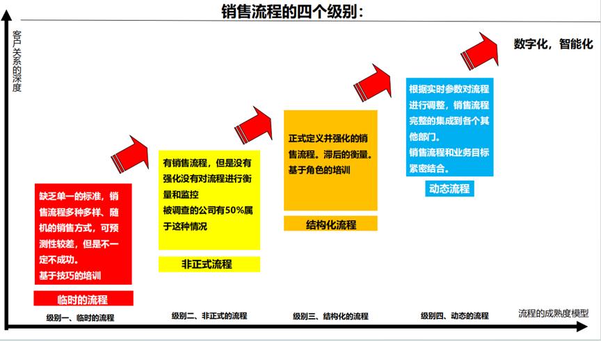 说到流程,销售流程有4个不同的级别。分别是:临时销售流程、非正式销售流程、结构化销售流程和动态销售流程。