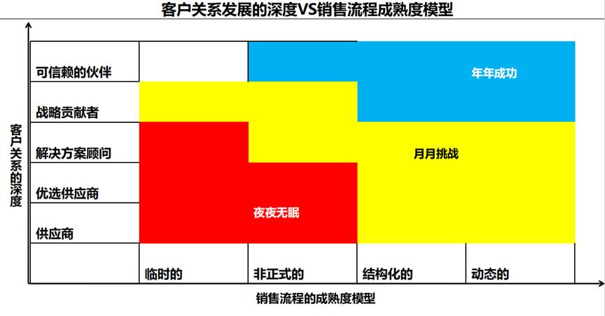 三种颜色代表三种企业的命运,同时也揭示了客户关系发展的深度和销售流程成熟度这两个方面相辅相成的问题。