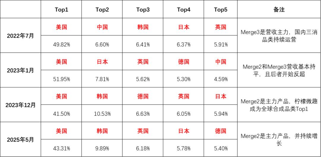 从 Merge3 出海时代起,美国作为大休闲游戏的全球最大市场,一直是柠檬微趣最重要的海外营收市场。2023 年年初,美国市场的营收占比一度来到 52%,此后公司发展重心逐渐由《Merge County》等的 Merge3 游戏转向《Gossip Harbor》为代表的 Merge2 游戏,以韩国为首的“新市场”展现出全新的营收潜力,美国市场的营收占比也开始明显下滑。但在过去半年,我们发现美国营收占比又在回升, 显示出柠檬微趣在成为品类冠军之后对成熟市场付费潜力的深度挖掘。