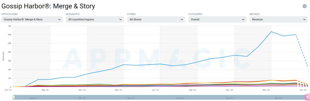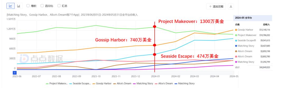 点点数据显示,《Matching Story》5 月全球流水为 470 万美金,最为接近本期出海手游收入 Top30 的关门流水,而头部的《Gossip Harbor》5 月流水已上探至 1210 万美金,分别为《Project Makeover》的 1.12 倍和《Seaside Escape》的 1.27 倍。而以《Gossip Harbor》为代表的合成游戏流水的增长和反超主要发生在今年上半年。