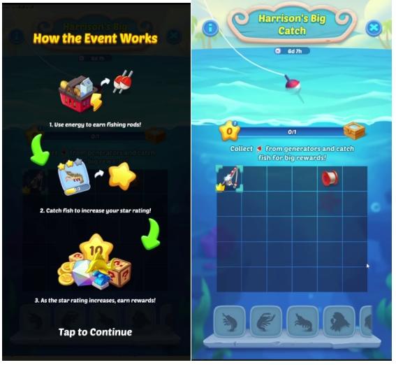 据 AppMagic 报道,《 Merge Mansion 》在二月开启名为“Lucky Catch Winter”的钓鱼主题活动,活动期内营收同比增长了 55%。眼看同行起飞,《Gossip Harbor》同期也上线了类似的活动,玩家会跳转到专属的合成棋盘格上,使用能量合成不同等级的鱼饵然后触发钓鱼。不过这里的钓鱼玩法并不涉及任何的操作,本质还是“抽盲盒”,玩家最终通过钓鱼累积的星级获取奖励。