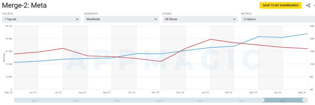 近一年全球Merge2游戏营收下载变化趋势图 (蓝色营收,红色下载)| 图片来源:AppMagic