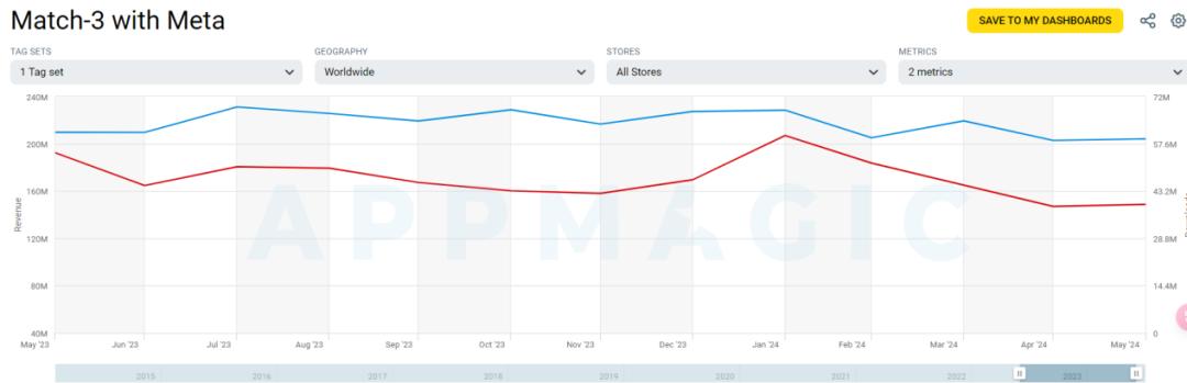 近一年全球三消游戏营收下载变化趋势图 (蓝色营收,红色下载)| 图片来源:AppMagic