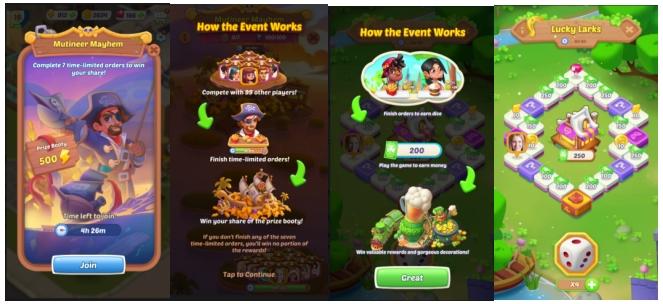 非常规性活动通常设计会更为复杂,它们以节日活动/分支故事等作为主题包装,提供新剧情、新装修场景或新玩法,持续时间一般在几天到 3 周不等,普遍来说非常规活动的可玩性更强,刺激玩家内购的机会也更大。在梳理《Gossip Harbor》上半年的运营活动中,我们也在其非常规性活动中发现了几个非常有意思的思路: