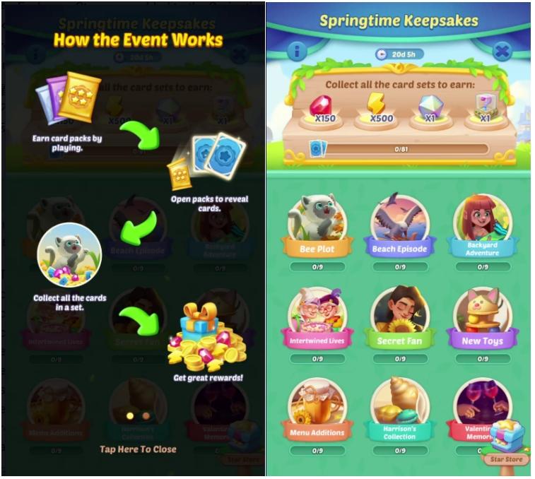 《Gossip Harbor》在 4 月和 5 月的收入峰值都出现在一个名为 Springtime Keepsakes 的收藏活动期间。玩家需要在活动期收集一组 81 张的卡牌集,玩家通过核心的合成玩法获得卡包,之后“拆卡包”集卡,这种性质的玩法有机会提高玩家的参与度,同时抽卡带来抽取到重复卡牌的可能性也一定程度上减缓了内容消耗,刺激用户不断参与合成而推动游戏的内购收入。最近 3 个月中,《Gossip Harbor》两次开启这一活动,在其助推下 5 月底迎来单日流水的峰值 53.4 万美金。