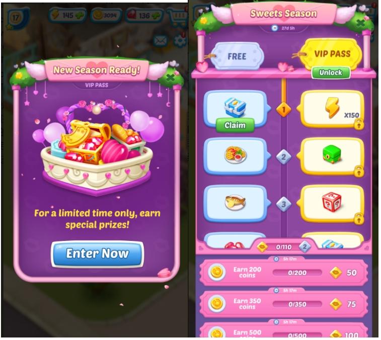 我们可以简单将目前《Gossip Harbor》游戏内的活动分成两种,常规活动和非常规活动。常规活动按持续时长分为季节活动(以月为单位)和短期活动(一般为期三天),二者核心机制类似,主要是设立里程碑,让玩家在完成订单的过程中可不断获得额外的活动积分以兑换奖励,增强玩家目标感以保障留存,其常规性主要体现在玩法相对“模板化”,更多只是主题和 UI 的变化。