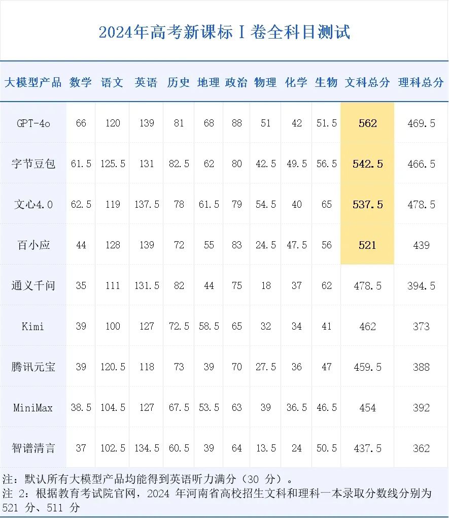 根据今天公布的河南高考分数线,最高分的 GPT-4o 可以在国内最「卷」的河南超过一本线 41 分,豆包 542.5 分的文科成绩也稳稳超过一本线,紧随其后的是 537.5 分的文心 4.0,以及正好卡到文科一本录取分数线 521 分的百小应。