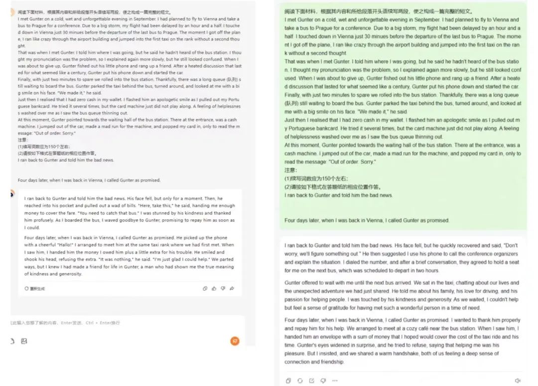 而在应对「读后续写」的要求时,较多模型在情节设置有些逻辑不顺或者不合理问题,以及漏掉了作文题目中提及的 promise 的内容。