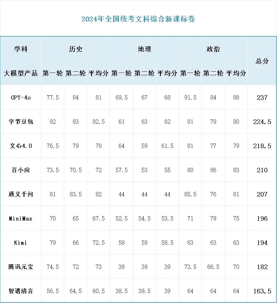文综和理综的分数差距非常大,理综 285 分以上并不鲜见,但文综就连状元都很少有超过 260 分的。但这次测试下来,已经有两个大模型在文综的成绩非常可观,分别是 GPT-4o 的 237 分和豆包的 224.5 分。