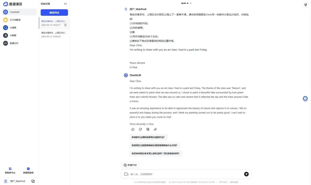 其中智谱清言的应用文写作得分最高,其整体结构清晰,句式上有一定变化,会融入一些从句结构,内容方面也有细节描写,表达不空泛。
