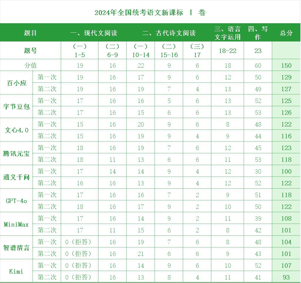那么具体每个学科大模型的表现如何?让我们先从高考第一门的语文开始说起。