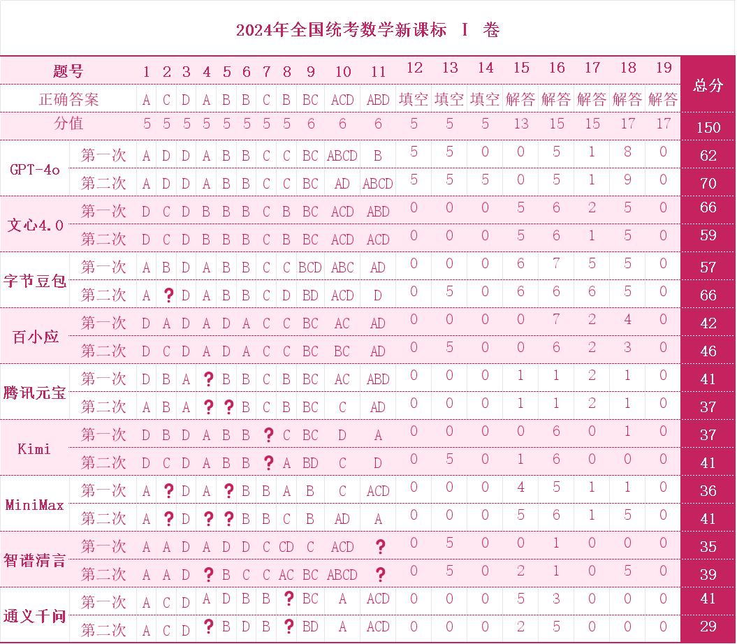 判分方式与人类考生统一标准:选择题和填空题只看最终结果,不考虑模型解题过程是否准确;多选题如提交错误答案为零分,如提交部分正确答案,则按相应比例给分;解答题由测试团队参考标准答案,按照解题步骤算分。