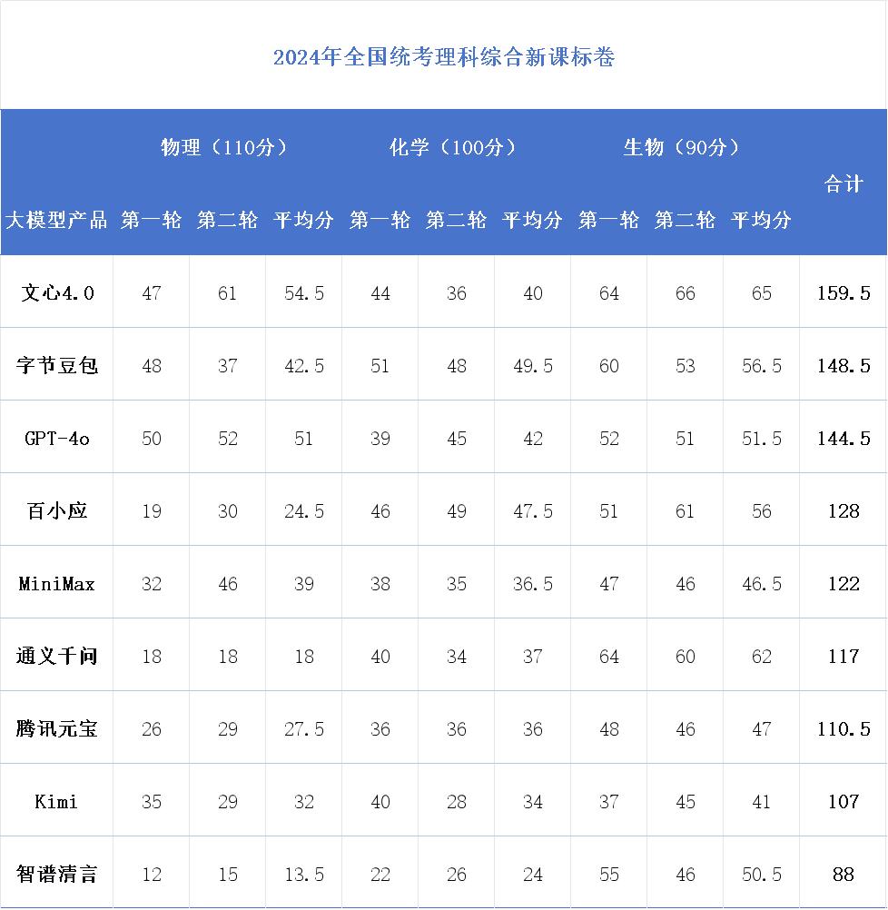 在整体突出实验探究能力考查的物理和化学学科,各模型目前仍无法及格,平均分只有 39 分和 34 分(满分是 110 和 100)。