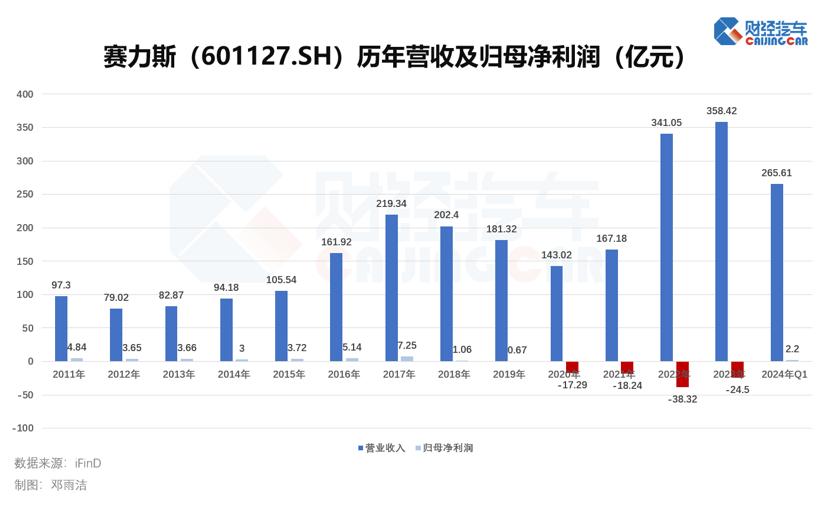 销量带动下,赛力斯在2024年一季度也首次扭亏为盈,实现归母净利润2.2亿元,较上年同期增加8.45亿元,市值同步飙升。