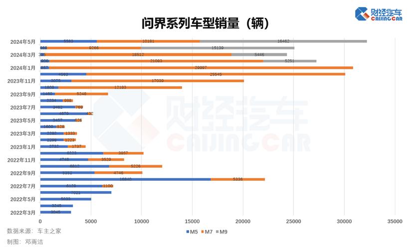 从2023年第四季度起,问界销量开始迅速增加。2023年9月至2024年5月,问界销量从6708辆升至32226辆,增长380.4%。