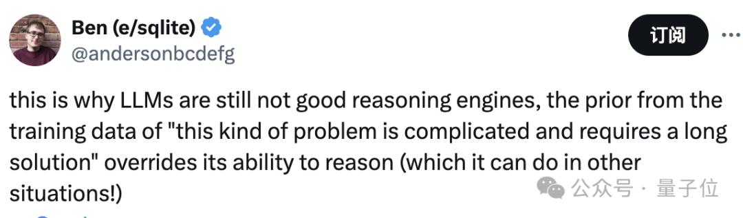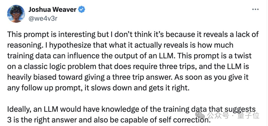 有网友分析,这种现象可能并不意味着大模型推理能力的缺乏,实际上它揭示了训练数据对大模型输出的影响。