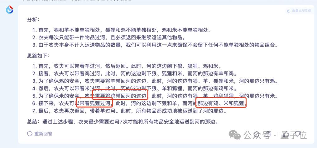比如文心一言,前面说得没什么问题,但最后把狐狸带回原来的岸边后忘了再带过去,最终没有完成任务: