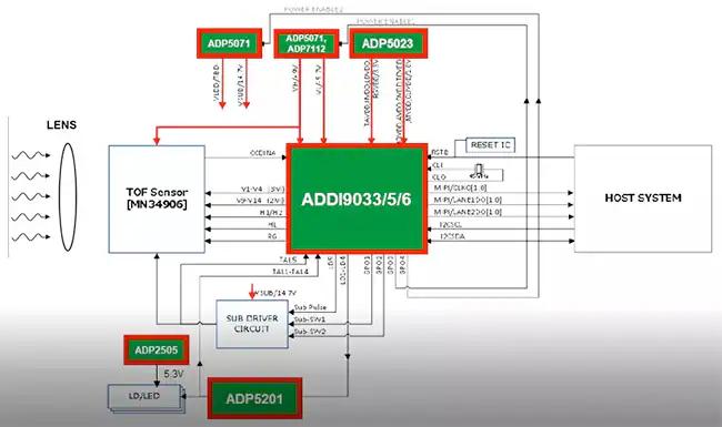 作为ToF方案的核心器件之一,ADI的ToF前端芯片ADDI903x系列支持CCD红外光ToF传感器,分辨率可达640 x 480。ADDI903x可将影像信号转换为数字信号,并提供高精确度的脉波时间控制器,闭回路设计,让激光二极管控制的脉波宽度更准确,进而可以得到更精准的深度数据。
