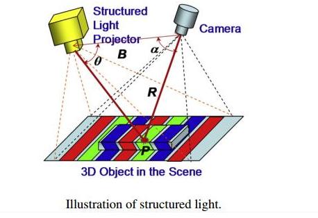 结构光是一种通过投影仪主动发射的主动投影技术,应用场景包括3D扫描、机器视觉、机器人导航等。它通过计算结构化光斑照射到物品表面的畸变,从而生成深度图,主要硬件有投射仪、相机。