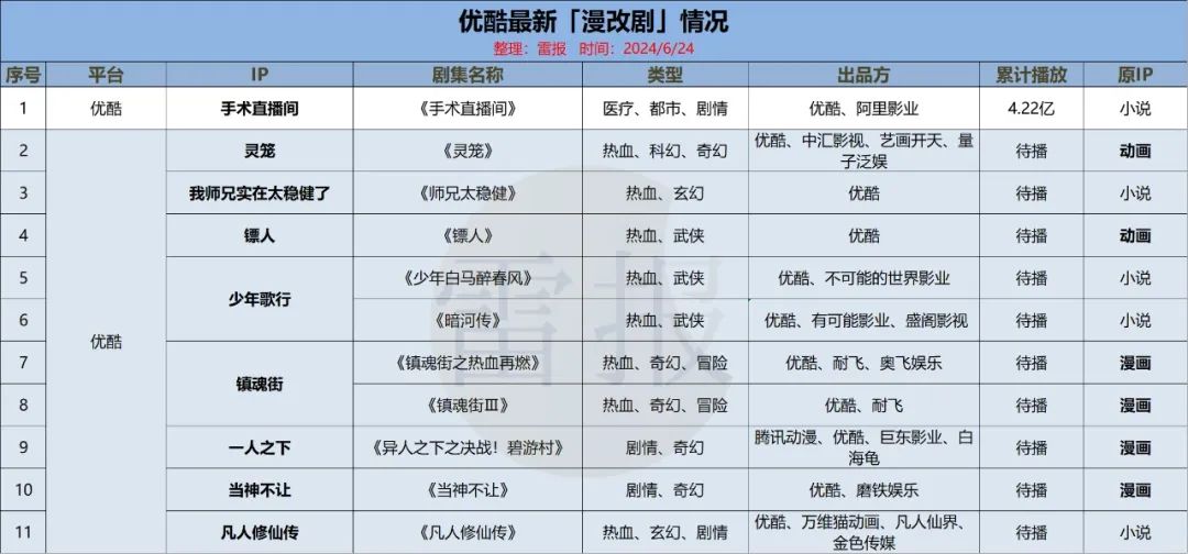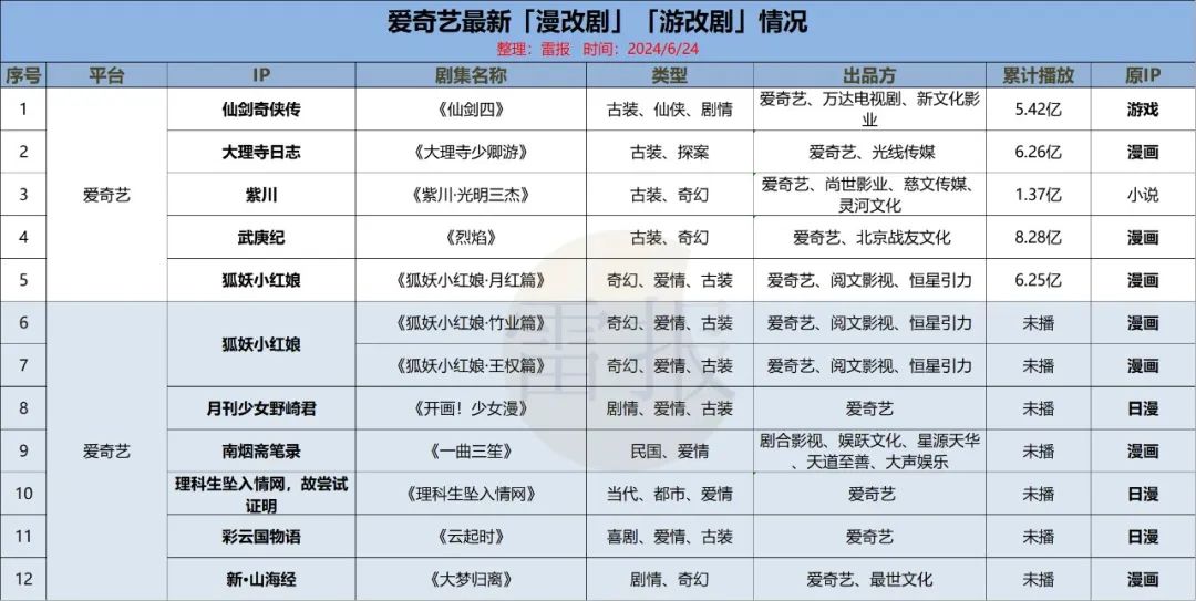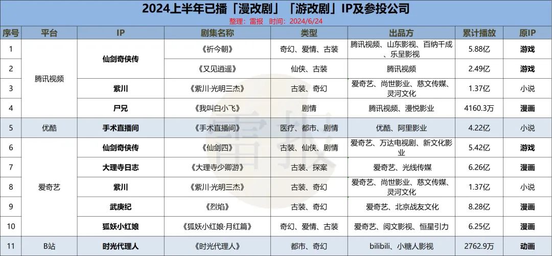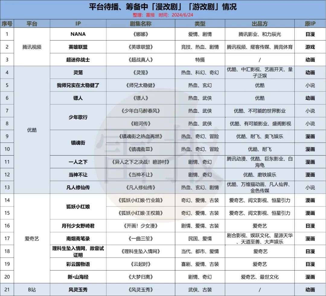 详细来看,雷报盘点了2024年上半年,各平台已播漫改、游改剧的IP及参投公司情况(人工统计存在误差),其中部分作品在双平台播出,因此上半年平台实际上新漫改剧共计10部,另外,还有至少21部剧集待播或者筹备中。