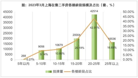 比如,2023年3月份上海挂牌在售二手房源中,20年楼龄占比高达60%,10年以内楼龄的房子占比不到10%;广州存量二手房源中,20年楼龄的房源占比43%;目前,深圳在售二手房源中,有一半房源楼龄在15-24年之间(2000-2009年),超过20年楼龄的占比20%以上。
