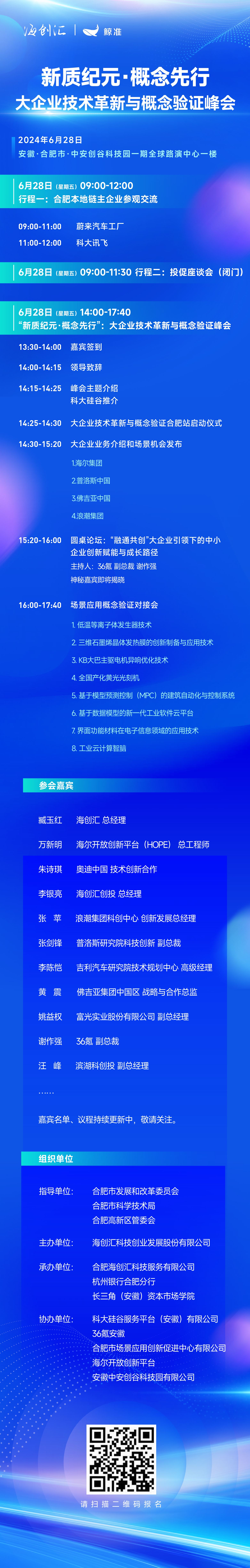 本次峰会由合肥市发展和改革委员会、合肥市科学技术局、合肥高新区管委会指导,海创汇科技创业发展股份有限公司主办,合肥海创汇科技服务有限公司、杭州银行合肥分行、长三角(安徽)资本市场学院承办,科大硅谷服务平台(安徽)有限公司、36氪安徽、合肥市场景应用创新促进中心有限公司、海尔开放创新平台、安徽中安创谷科技园有限公司共同协办。