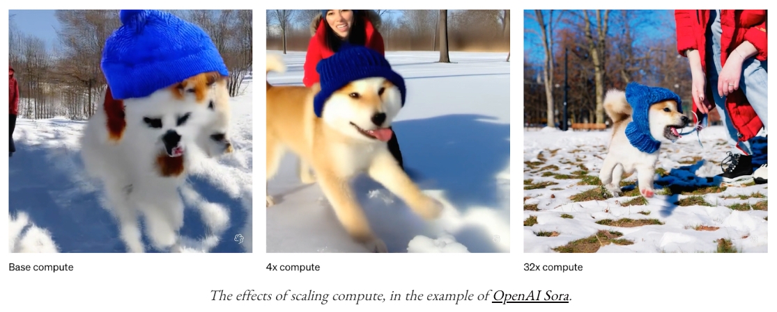 他的证据是,到目前为止,有效计算每提升一个数量级,模型都会“可预测地、可靠地”变得更好。视频生成就是这种情况: