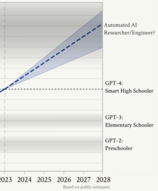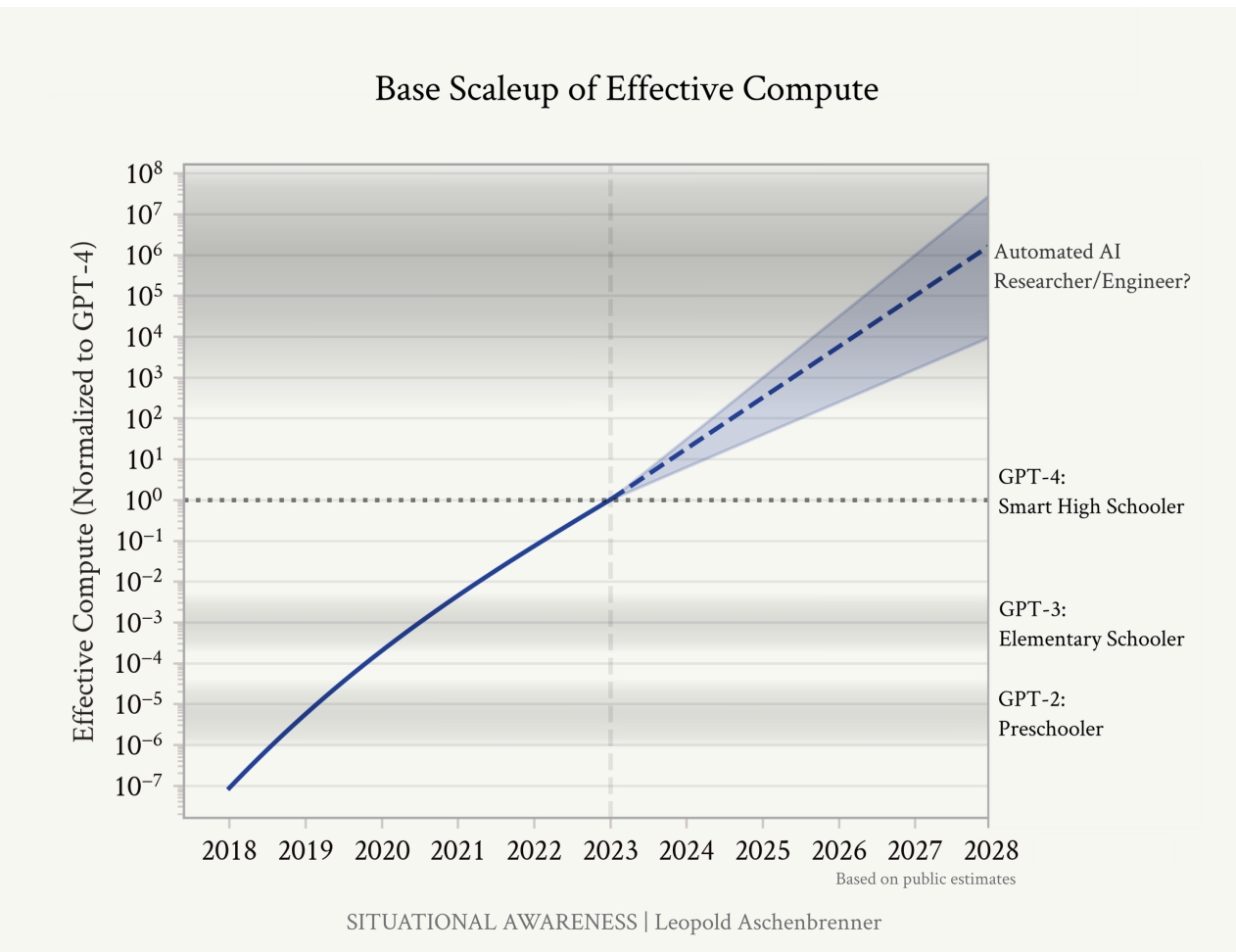 今天之所以要讨论这个话题,是因为这张图。此图摘自最近被 OpenAI 的 Superalignment 研究团队解雇的 Leopold Aschenbrenner 的系列长文(长达 165 页)。该系列文章的标题叫做“情境感知”( Situational Awareness),他论证了为什么第二组是正确的,以及我们应该怎么做。