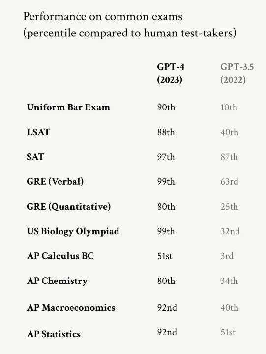 GPT 系列模型也取得了类似的跳跃式改进,现在它们在标准化测试的表现可以超越绝大多数人类。