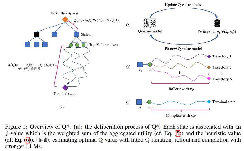 在《Q*: Improving Multi-step Reasoning for LLMs with Deliberative Planning》论文中,研究人员首先将大语言模型的推理轨迹分解为若干个状态,对于每一个状态,参考DeepCubeA中的设计,通过将定义Path Cost的g(s_t)函数和定义Accumulated Reward的Q*(s_t, a_t)集成到同一个f(s_t)函数内,实现了对历史状态收益和未来期望收益的综合考虑。最后利用A*搜索算法对状态进行最佳优先搜索,实现了对复杂推理任务的全盘规划,从而提升开源模型在推理任务上的性能。