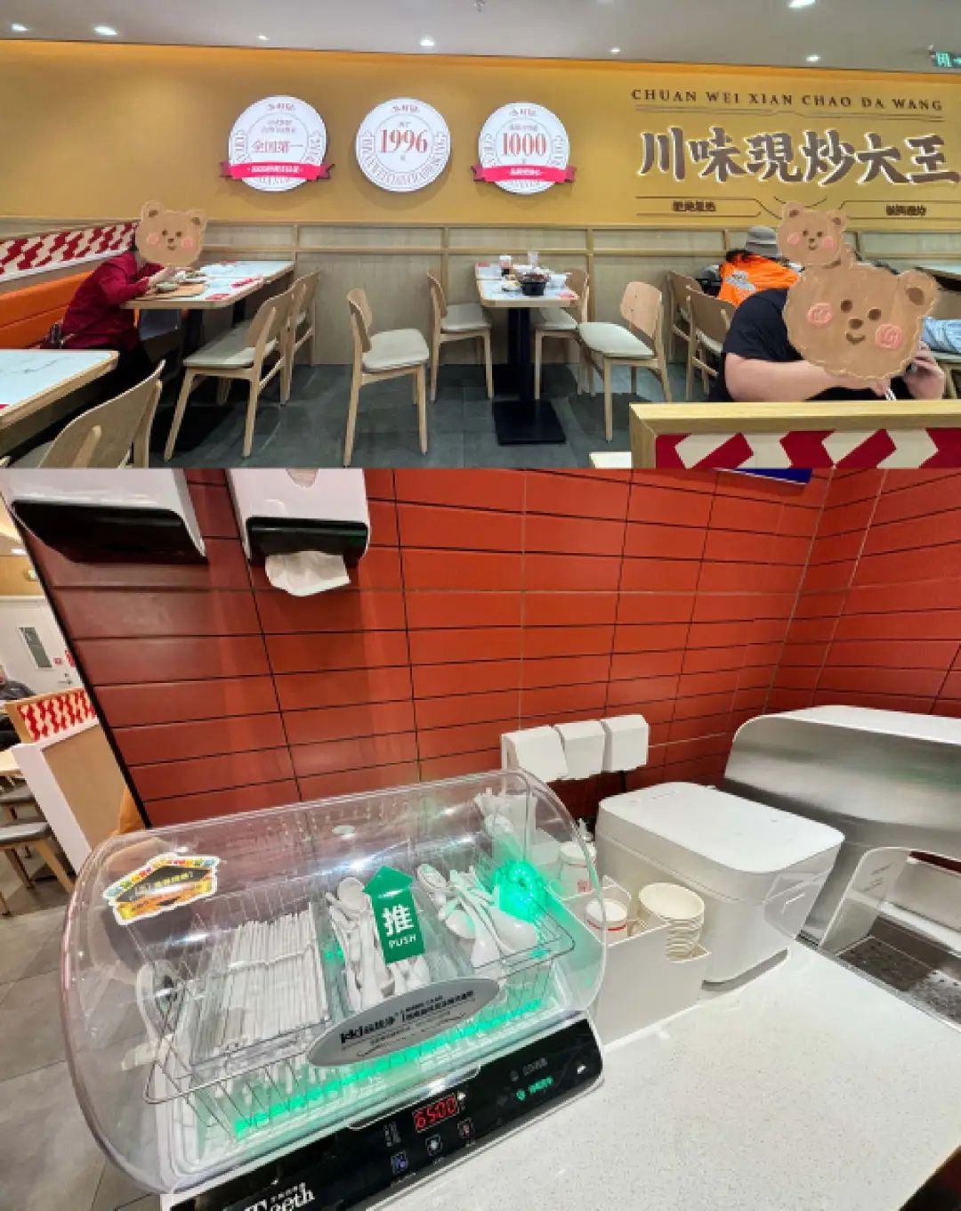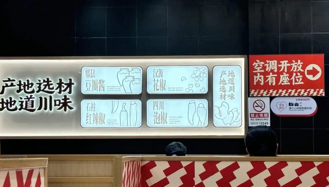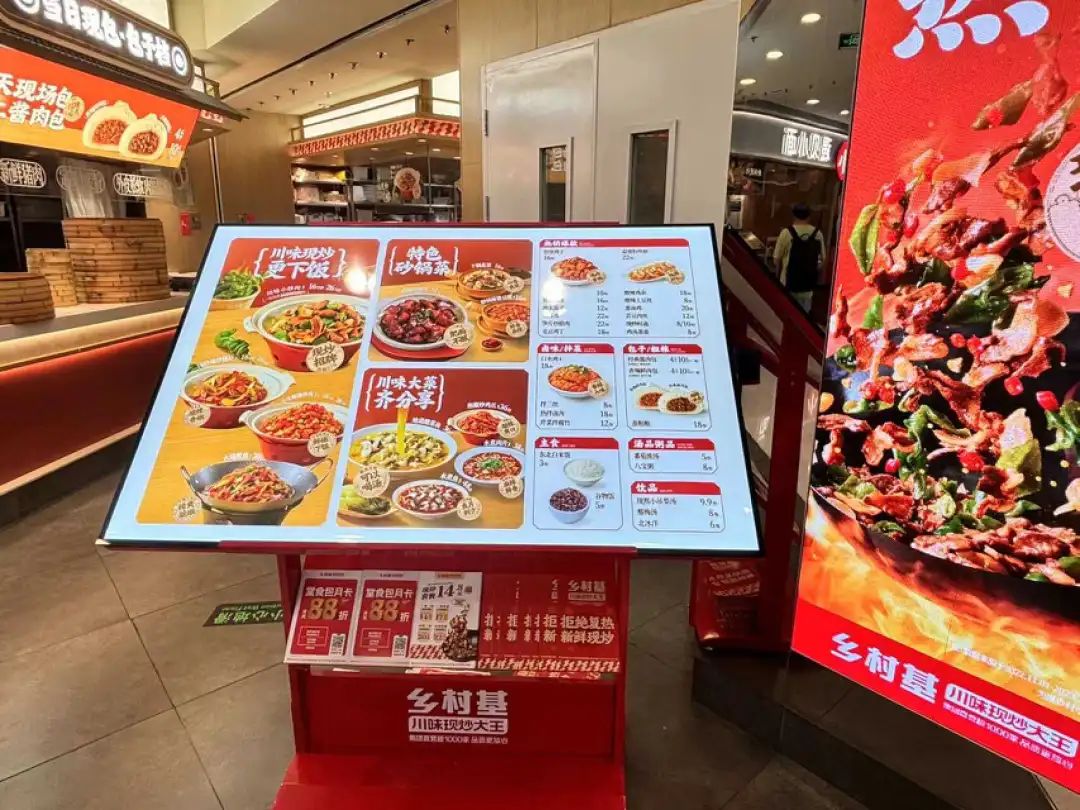 这时候的乡村基就额外眉清目秀,还没进门你就能看到有关【现炒】的宣传:从菜单、招牌到墙面,“川味现炒”以各种字体、在各个角落里反复出现。