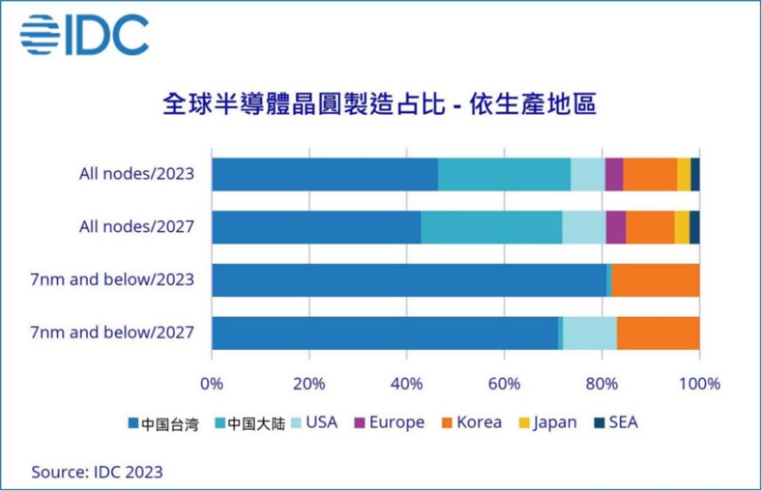中国台湾的主导地位很大程度上归功于台积电,台积电占据近乎一半的晶圆代工市场份额。但随着台积电去各国建厂,来自中国台湾本地的产能将会是肉眼可见的减少。IDC预计,到2027年,中国台湾芯片制造商在代工业务中的份额将从2022年的46%降至43%。