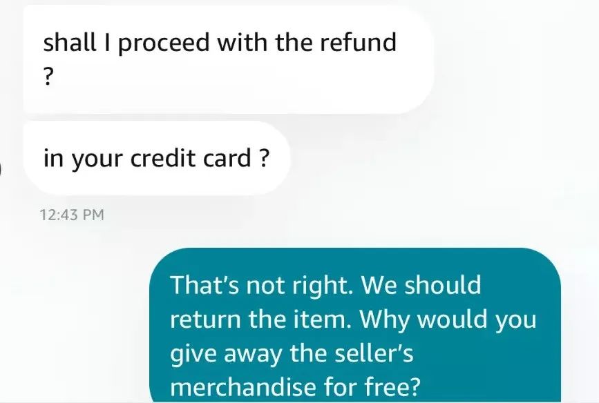 例如一位消费者联系亚马逊客服申请退货,并表示愿意承担退货运费,但是亚马逊客服的回复却让他感到震惊:申请全额退款,并保留商品。