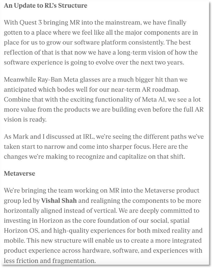 不断裁员后,针对 Reality Labs的改革仍在继续,该部门将迎来重大重组,原有部门被拆分为负责Quest头显产品线、社交平台Horizon以及相关技术的“元宇宙部门”,以及涵盖Meta的其他软硬件产品、包括与Ray-Ban合作智能眼镜的“可穿戴设备”部门。