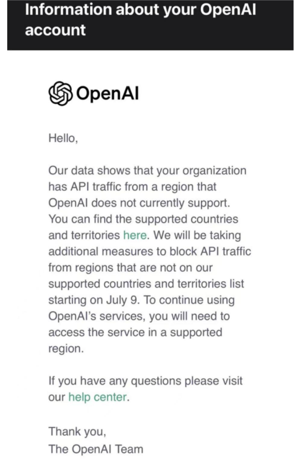 令高瑞麟陷入两难的,是在奥特曼领导下的OpenAI的一封推送邮件。在6月25日发出的邮件中,OpenAI表示,从今年7月9日开始,将阻止来自非支持国家和地区的API(应用程序接口)服务。受影响组织若希望继续使用OpenAI的服务,必须在其支持的国家或地区内访问。