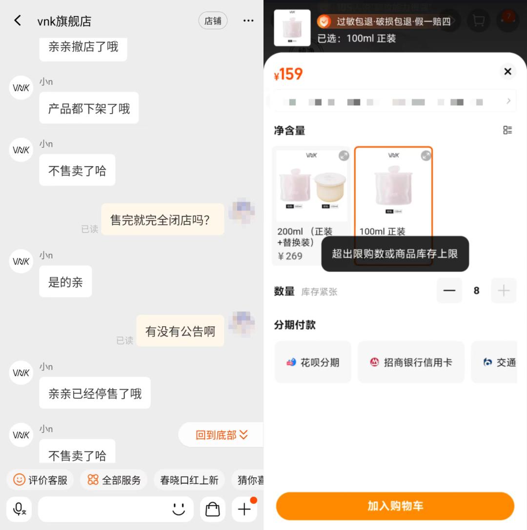 搜索VNK旗舰店,可以看到,虽然店铺首页导览图仍在,但宝贝页面中显示店内商品已被全部下架,仅剩最后一款已售2万+的名为VNK净亮精华白月光卸妆膏的产品,售价159元,其中“100ml 正装”库存仅剩8,但邮费费用为999元,应为防拍邮费。经询问,客服表示已经撤店,所有产品全部下架,不再售卖。至于是否会发布公告,客服并未回复。