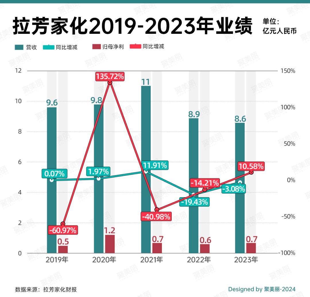 另外再结合往期财报来看,2023年拉芳家化营收为近五年最低,归母净利润与2021年相当,此外,拉芳家化的营收曲线似乎与2020年VNK被收购后的业绩表现重合,均是在2021年增长后呈逐年下滑之势。